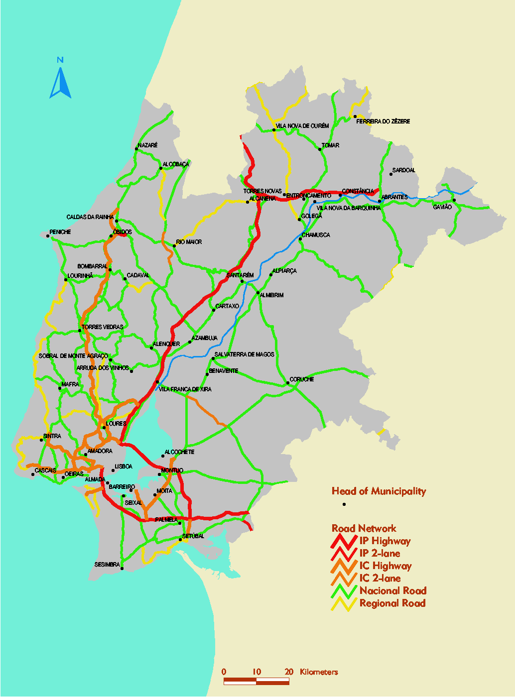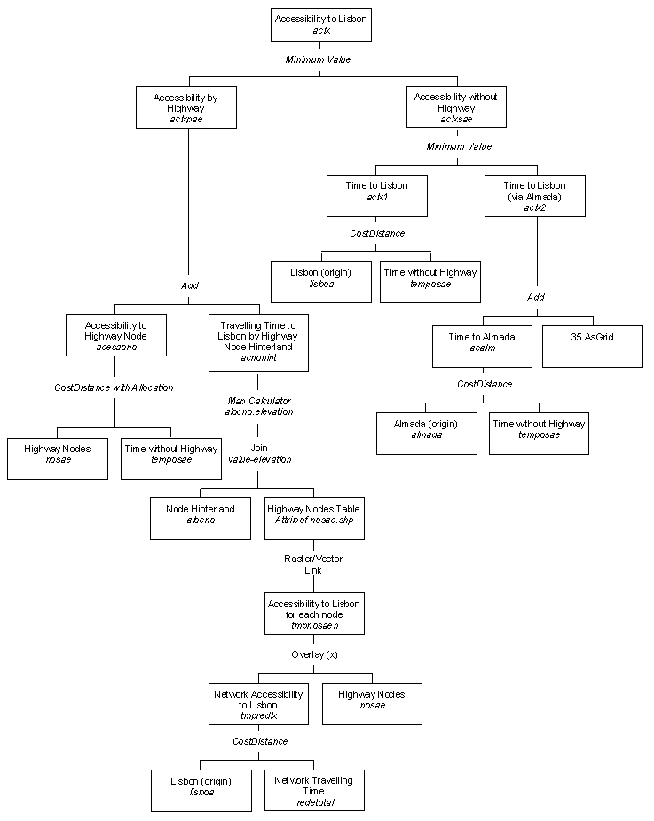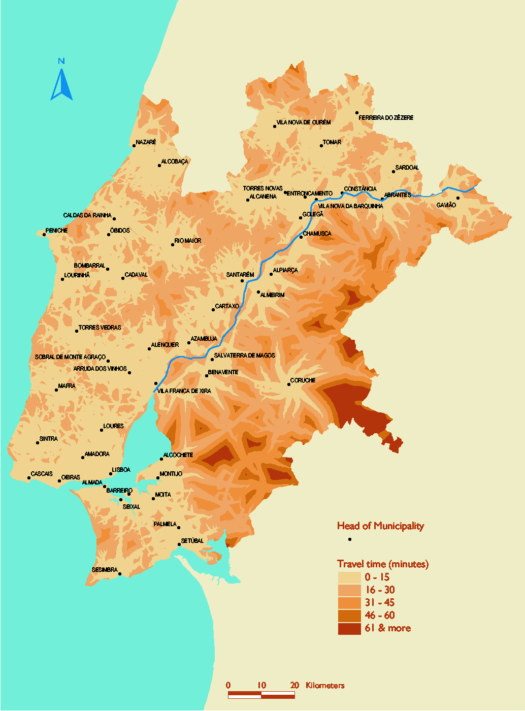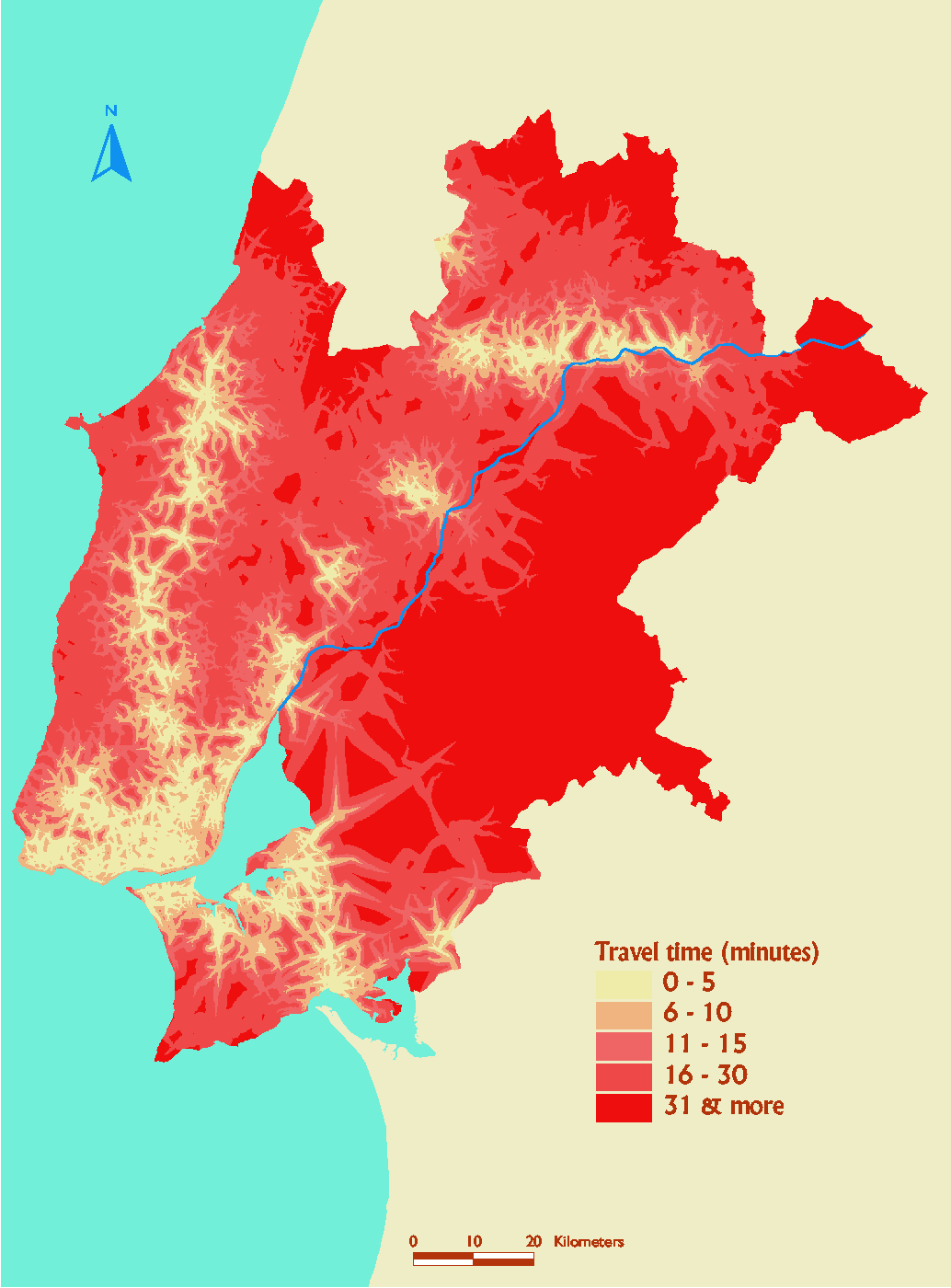 Because there are restrictions for crossing the river in Lisbon (there is only highway crossing of the river), we have considered the possibility of using the ferryboat that connects Lisbon to Almada. So the travelling time grid that considers only the regular roads is the result of the minimum value of travelling from Lisbon or from Almada (south side of the river) increased by 35 minutes (crossing time).