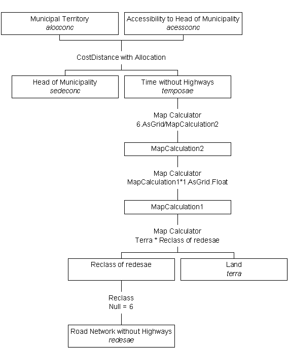 In this case we have considered all roads except highways--the calculation was quite easy. The following schema describes the data workflow that was used to obtain the map shown above.