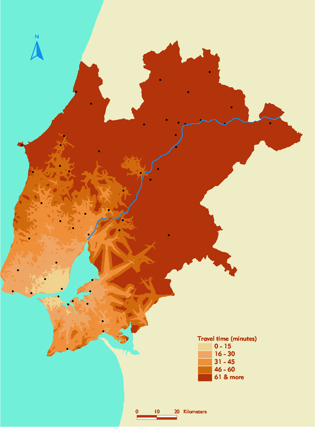 Accessibility to Lisbon. The idea is to find the accessibility to Lisbon considering travel time starting from the city centroid and the whole road network, including highways. This is a more complex process due to specific behavior of highways and the river crossing.