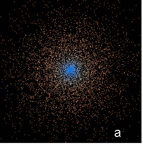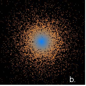 Simulations using the neutral model produced morphologies shown in Figures 1a and1b. Figure 1a shows the distribution of developed cells according to the negative exponential function given by equation (1) in which a city grows on an ideal surface on which there are no influences or impediments to growth. Figure 1b shows the distribution of developed cells for which the infrastructure grid was implemented to allocate births. The distribution of cells is much more 'clumped,' as is true of real cities, where urban development attracts further development.