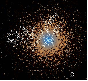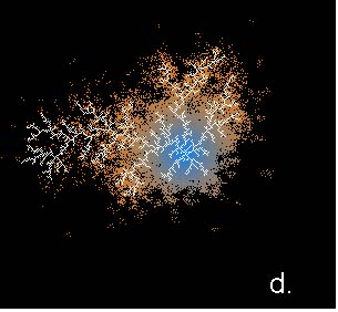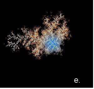 The growth of cities is influenced strongly by socio-economic and biophysical constraints, and institutional controls. Physical factors such as water bodies and steep terrain constrain growth as do institutional controls that prohibit growth. Economic factors such as distance from transport networks, distance from commercial outlets and land values also play a significant role. To demonstrate the influence of constraints on the distribution of developed cells shown in Figure 1b., an artificial constraint surface similar to a transport network was introduced into the simulations. This network, shown in Figure 1c., superimposed on Figure 1b, was developed using a process of Diffusion Limited Aggregation (DLA) (Batty,1991). Distance from the network to any cell