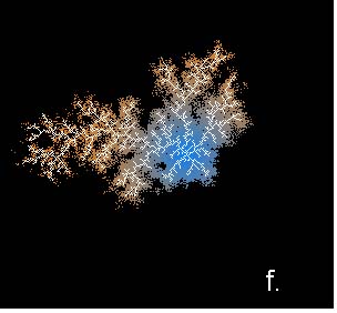 Figure 1. a) Results of a simulation using the neutral model showing simple negative exponential growth in which there are no influences or impediments to growth. b) negative exponential growth with implementation of the infrastructure grid causing 'clumping' of development units. c) an artificial transport network generated using a process of Diffusion Limited Aggregation superimposed on figure b. d,e,f) results of a simulation imposing increasing constraint on growth associated with distance the artificial transport network.