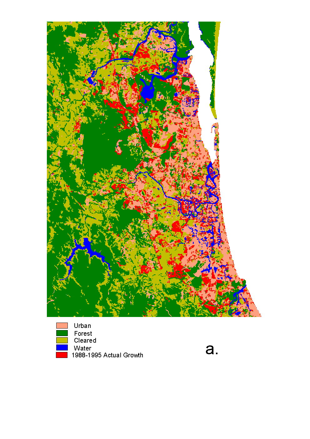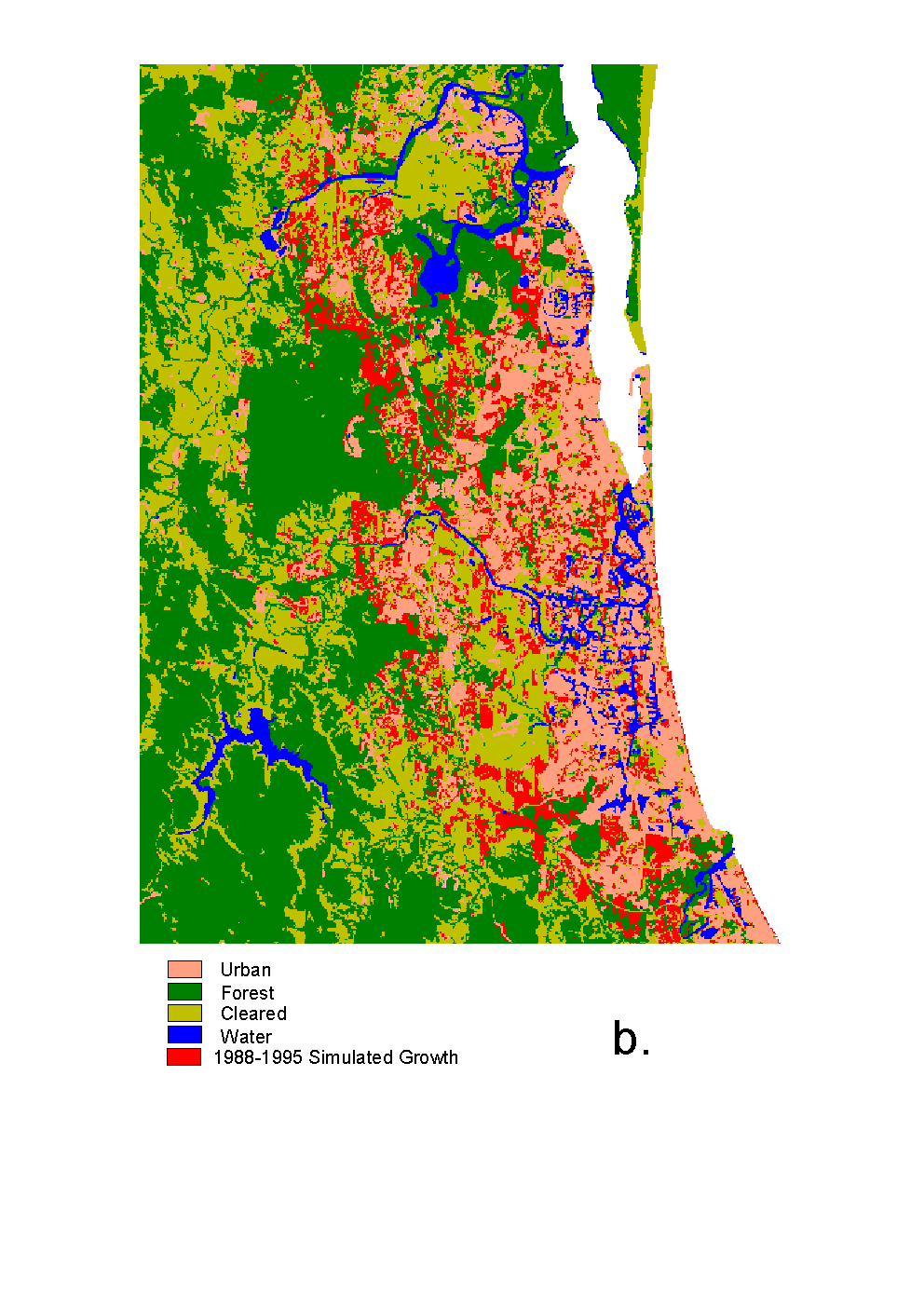 Figure 2. a.) Actual urban growth from 1988 to 1995 for the Gold Coast area. b.) Simulated urban growth for the Gold Coast area.