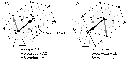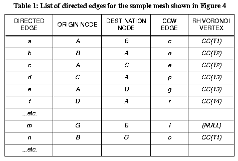 Each directed edge data object also includes the coordinates of the Voronoi vertex associated with the triangle on its right-hand side (clockwise) (Figure 1). Pseudo-code for the DirectedEdge data structure is given in Figure 3, and an example list of edges for a simple mesh is given in Table 1. Complementary directed edges are stored pairwise on the list (Table 1), which makes it possible to quickly retrieve the complement of any given edge. In addition, certain operations such as length and slope calculation only need to be performed for one member of each edge pair, with the result simply assigned to the other. Storing directed edges pairwise makes it possible to do this easily by skipping every other edge on the list. In addition to topologic information, a directed edge object might include geometric properties such length, gradient, and the length of the associated Voronoi polygon edge (or Voronoi edge).