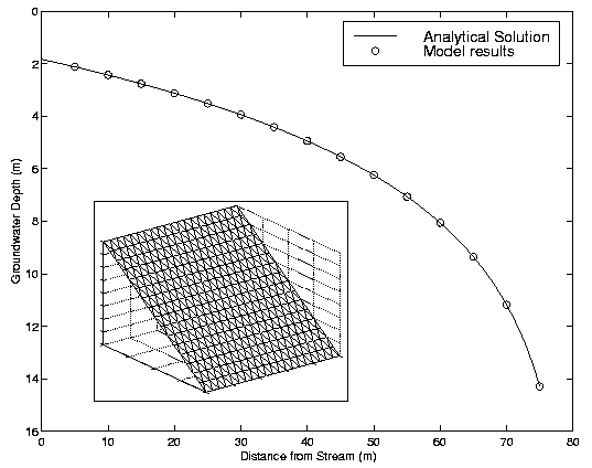 where hi is the groundwater table elevation at node i and T(hi) is transmissivity (in this example, transmissivity is assumed to vary with water table height, with the average transmissivity between nodes i and j used to compute the flux between them). Figure 10 compares the equilibrium water table height as computed from a simplified version of equation (5) with an analytical solution, assuming a simple linear hillslope geometry.