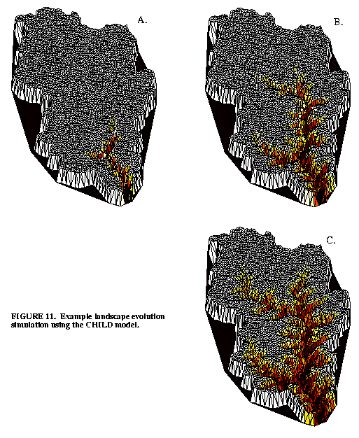 We have applied these data structures and algorithms in a simulation models of long-term landscape evolution (Tucker et al., 1997 and in prep.) and of catchment rainfall-runoff. Figure 11 shows a simulated drainage basin responding to a period of rapid baselevel lowering. Basin evolution is driven by a sequence of randomly generated storms, with fluvial erosion and sediment transport modeled on the basis of slope and total discharge at each point.