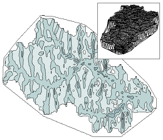 Figure 12 illustrates a hydrologic application of the same concepts. The figure shows simulated depth to the water table in a small catchment in Kansas in response to spatially uniform recharge. Water table depth at each point is computed using eq (5), assuming an expontial decrease in saturated hydraulic conductivity with depth. In both of these examples, the TIN framework is implemented in C++, with each data element (nodes, triangles, and directed edges) encapsulated within a single class. The hydrologic model and the landscape evolution model (Figure 11) use the same code for mesh handling and drainage network delineation, which highlights the advantages of a modular, object-oriented approach in terms of code reusability.