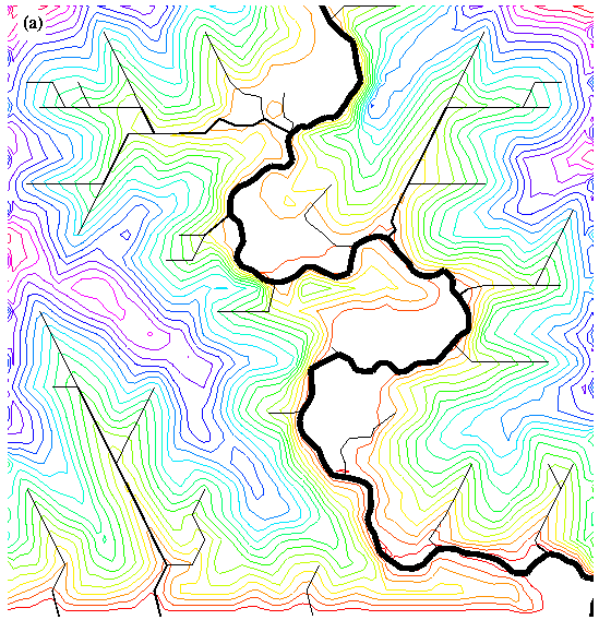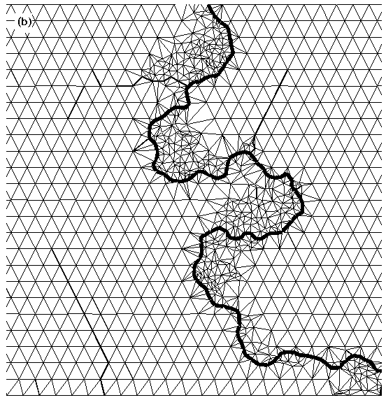 Figure 13: Simulation of 3D floodplain development by lateral stream migration (meandering). An adaptive meshing strategy is used to dynamically move, add, and delete points in response to lateral movement along the main channel. (a) Contour map of simulation. (b) Triangulation, showing densification of mesh in response to stream migration. Straight channel segments are artifacts of low mesh resolution outside of the meander belt.