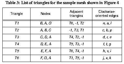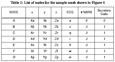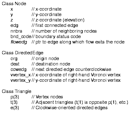 Unlike regular matrices, in which each node is connected to either four or eight adjacent neighbors, the number of neighbors connected to a given node in a Delaunay triangulation may in theory be arbitrarily large. Ideally, a data structure should represent this variable connectivity in a way that (1) provides rapid access to adjacent mesh elements without demanding excessive storage space, and (2) is flexible enough to handle dynamic changes in the mesh itself. For dynamic modeling applications, an additional requirement is the need to maximize computational speed. These requirements are satisfied through the use of the following data structure. The "Dual Edge" structure is adapted from the Quad Edge data structure of Guibas and Stolfi (1985), and consists of three geometric elements: nodes, triangles, and directed edges. The data structure is summarized in pseudo-code form in Figure 3.