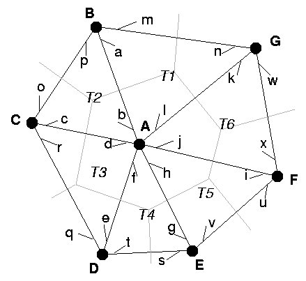 Figure 4: Sample mesh consisting of 7 nodes, 6 triangles, and 24 directed edges. Capital letters indicate nodes, numbers T1 etc denote triangles, and small letters indicate directed edges. Half-arrows pointing toward the destination node indicate the orientation of the directed edges.