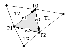 Figure 3: Pseudo-code summary of the DualEdge data structure, showing the data members belonging to Node, DirectedEdge, and Triangle objects.