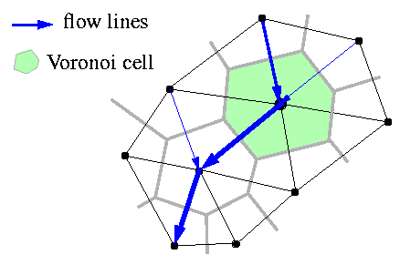 Here, we describe a simple "Voronoi-based" approach to routing that avoids these problems, though at the expense of added simplicity. Following Braun and Sambridge (1997), flow originating at any point within a node's Voronoi polygon is routed downslope along the steepest of the spokes connected to that node (Figure 6). By this method, the contributing area at node i is equal to the sum of the Voronoi areas of all nodes that flow to i (including i itself). An advantage of this approach is that it lends itself to finite-difference modeling, because each node has a unique watershed and drainage direction assigned to it. The primary disadvantages are: (1) drainage basin boundaries are defined by Voronoi polygons rather than by triangles, and (2) flow pathways and gradients are forced to follow triangle edges. The second limitation could be eliminated by adopting a more general flow routing procedure (e.g., Tarboton, 1997), though such an extension is beyond the scope of this paper.