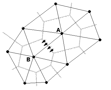 Figure 8: Illustration of mass flux across the Voronoi polygon face between two adjacent nodes. Mass flux per unit contour width is calculated based on the gradient between A and B, and total flux is obtained by multiplying by the width of the shared Voronoi polygon edge.