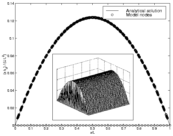 Figure 9: Numerical solution to hillslope diffusion equation (eq 4) on a 5000-triangle TIN (inset), compared with an analytical solution. TIN represents a rectangular domain with two fixed boundaries. Open circules show nodes in the TIN viewed from the side. Solid line shows analytical solution in 1D. (Circles along x-axis are boundary points).
