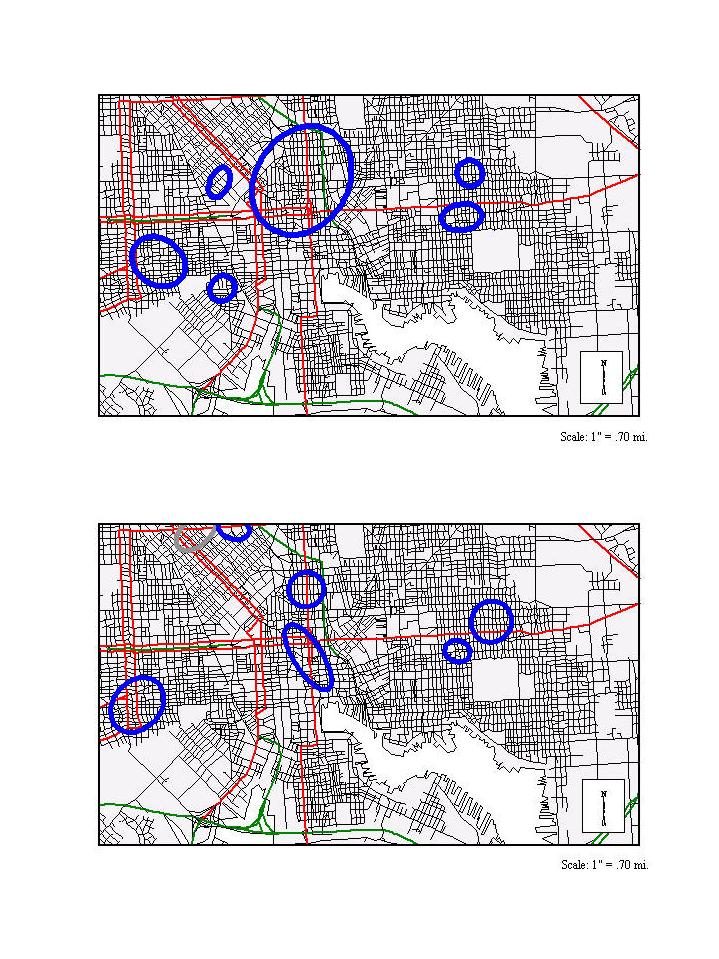 Figure 1: Hot spots of reported burglaries in 1988 (above) and 1990 (below).