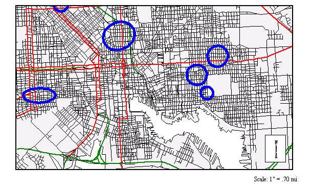 Burglary was the crime that was chosen for the analysis, due to the potential for it to be committed in residential or commercial areas, as well as in either affluent or impoverished neighborhoods. The street address of all reported burglaries committed during 1988, 1990, 1992, 1994, and 1996 were obtained from the Baltimore City Police Department. These addresses were geocoded in a GIS and "hot spots" were calculated for each of the years based on these registered coordinates. This allowed the high crime areas within the downtown to be visualized, and a determination to be made whether or not these areas had changed over time.