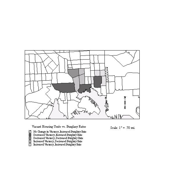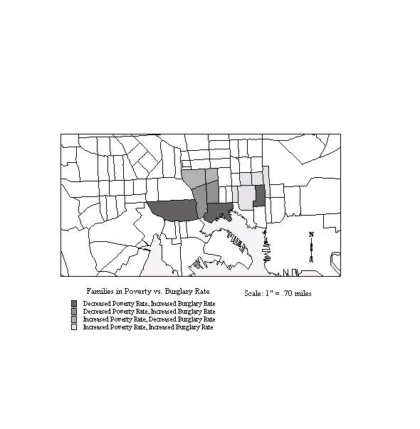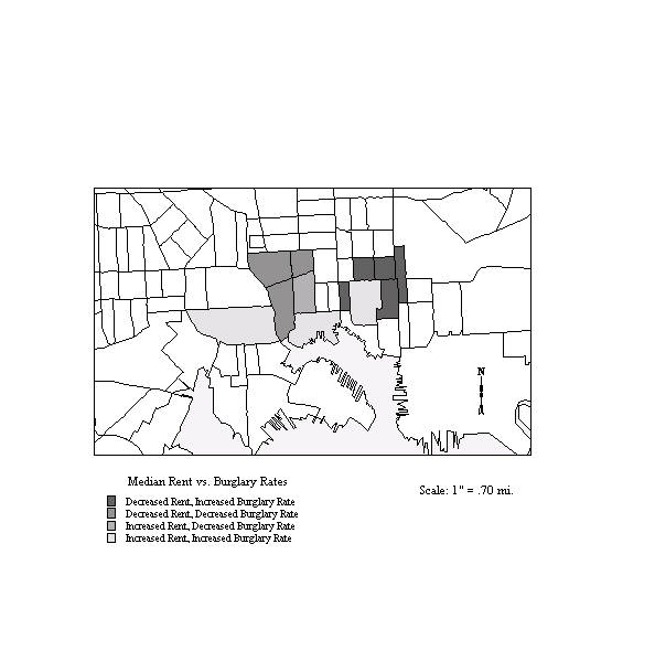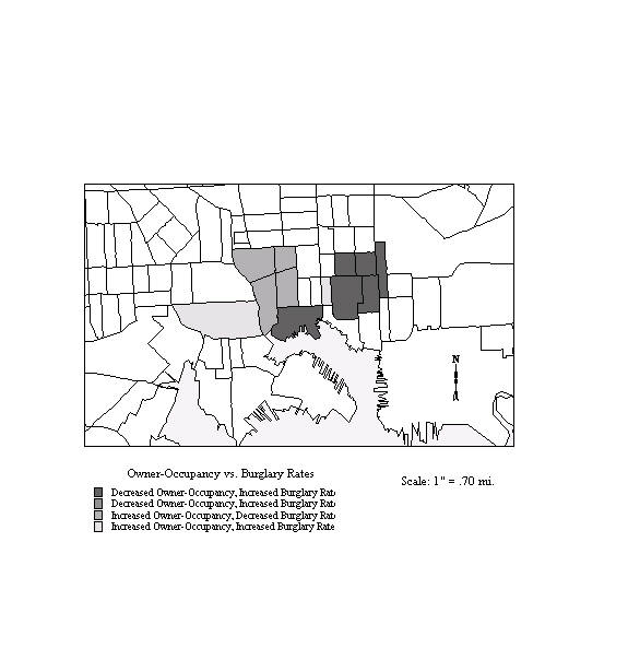 A series of maps, locating the areas experiencing changing socio-economic conditions and changing crime rates suggested a few spatial trends in the changing conditions within the downtown. Perhaps the most significant of these trends was that the census tracts around the Inner Harbor and Fells Point were shown to have experienced improved socio-economic conditions, while the Patterson Park area witnessed deepening socio-economic problems and elevated crime rates.