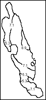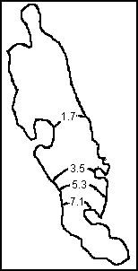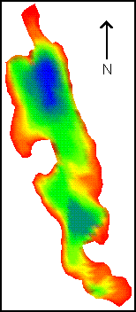 The lake has relatively shallow bays along its east and west sides (Figure 1), which often result in great spatial variation in flow properties across the lake (occasionally, water in the shallows may be near-stationary compared to water in the central trough). Stratification occurs from May until early October, with a thermocline occurring at approximately 6 m. Subsurface return flows occur just above this thermocline (George and Heaney, 1978).