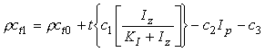 where rho ct1 is the density at t=1, rho ct0 is the density at t=0, c1 is the rate of constant density increase (0.132 kg m-3 min-1), c2 is the rate of constant density decrease (1.67*10-5 kg m-3 min-1), c3 is the minimal rate of density increase (0.023 kg m-3 min-1), KI is the half-saturation irradiance for a maximum rate of density increase (25 micromol m2 s-1), Iz is the irradiance at depth z and Ip is the average irradiance experienced in the previous day. According to this equation, cell density depends upon the balance between the rate of carbohydrate increase due to photosynthesis (c1), and the rate of carbohydrate decrease due to respiration (c2 and c3). Irradiance was estimated as a function of depth using the Beer-Lambert law: