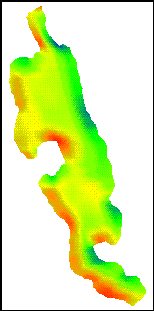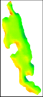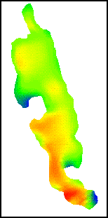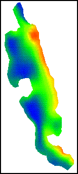 Some of the discrepancies between the simulated and measured horizontal distributions may be related to the sampling regime that in the north missed the area of simulated high concentration, and near to the southern outlet missed the areas of simulated low and high concentrations on the west and east shores, respectively. Sampling the simulated distribution with the regime used on 9 August 1973 and interpolating a new distribution would create one that was more similar to that measured. Additionally, use of fine spatial resolution remote sensing data (George 1993) has shown patterns consistent with those simulated, so the simulated variation is not atypical for this lake. The position of the simulated peak concentration several hundred metres north of that measured suggests that the eastward component of the near surface velocity vector was too small relative to the northward component in the north-east part of the lake. The large underestimation of surface concentration in the north-west bay may likewise be attributed to inaccurate estimation of the velocity field - a problem that has been encountered in past CFD modelling of Esthwaite Water (Falconer et al., 1991).