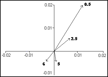 Figure 3. Current vectors for Esthwaite Water (15:00 2 August 1973) as a function of depth: values at the end of each arrow are the depth (m), values on x and y axes are u and v velocity component (m s-1).