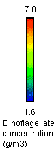 Measured and simulated surface dinoflagellate distributions were similar (Figure 4), although the simulation estimated an east-west trend that was not observed in the field.