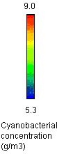 The initial vertical distribution of cyanobacteria was parameterised with a maximum at the surface and a minimum at 8 m depth. This distribution was simulated according to the estimated change in irradiance levels, buoyancy, and rising velocity that had occurred over the previous week (with the assumption that the initial mean cyanobacteria population in the upper 8 m of the water column was 7 g m-3 (chlorophyll-a concentration of 80 mg m-3).