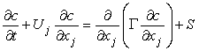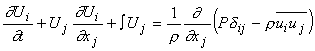 where U is the Reynolds-averaged velocity (convection), u is the fluctuating velocity (turbulence), x is a space variable, P is pressure, rho is water density, deltaij is the Kronecker delta term (which is 1 if i = j and 0 if i <> j), and t is time. Terms on the left hand side of the equation are the transient, convective and Coriolis terms. Terms on the right hand side of the equation are the convective and Reynold's stress term.