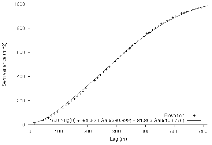 An omnidirectional variogram was estimated for the entire region (Figure 1). All standard experimental variograms were estimated and all models were fitted in Gstat (Pebesma and Wesseling, 1998). The shape of the landform was a gradually sloping valley. This was apparent from the form of the variogram: semivariance increased without limit, a common indication of the presence of a low-frequency trend (Starks and Fang, 1982). A variogram of residuals from a second-order polynomial, for which the range and sill were more distinct, was used instead and kriging was carried out using the residuals. A nugget and two Gaussian structures (the coefficients are given in Figure 2) were fitted to the variogram. It was found necessary to increase the nugget beyond that originally fitted (to about 1.4% of the sill) as the use of Gaussian model components resulted initially in negative kriging variances. Problems with the kriging matrix are frequently encountered when Gaussian models are used (Deutsch and Journel, 1998).