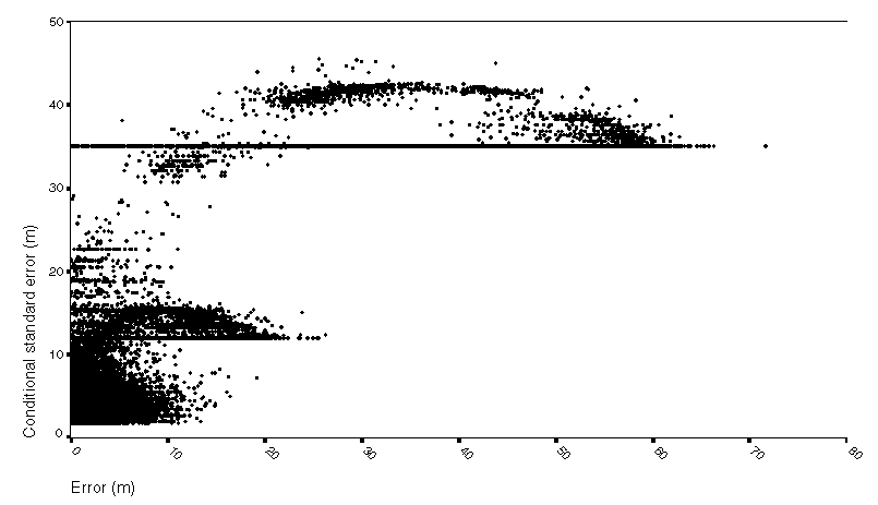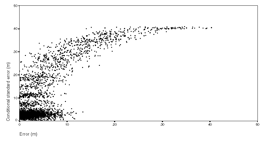 The correlation between the OK variance and the errors was, as expected, very small. The r2 figures typically being of the order of 0.001. In contrast the r2 figures for the IK variance against IK errors were: 10 m, 0.779; 15 m, 0.800; 20 m, 0.774; 25 m, 0.748; 30 m, 0.737; 35 m, 0.715; however, a large proportion of the estimates clearly deviated from a linear relation (as illustrated in Figure 4, for IK with a sample spacing of 10 m). The fairly large coefficients of determination were primarily due to the fact that most of the estimation standard errors tended to increase in value with increase in error, though in a curvilinear manner. The bulk of errors of less than 10 m were represented well by the IK variance, although errors between 10 m and 40 m were frequently over-estimated while error over 40 m tended to be under-estimated. The observed deviations in the plot were due, in part, to the problems noted above in relation to the use of IK in the presence of a low-frequency trend, which has not been accounted for sufficiently by detrending. The strips of values parallel with the x-axis are indicative of ‘platforms’ of identical values formed for the reason elucidated above; therefore, as for the estimates, there were large sub-regions for which the conditional variance was identical and, locally, did not represent estimation error well.