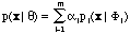 where x is the measured feature (vector) value, p is the probability density function describing the entire data set to be analyzed,