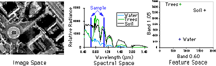 Feature Space. The third basis for data representation also begins with a spectral focus, i.e., that energy radiance or reflectance vs. wavelength contains the desired information, but it is less related to pictures or graphs. It began by noting that the function of the sensor system inherently is to sample the continuous function of emitted and reflected energy vs. wavelength and convert it to a set of measurements associated with a pixel that constitutes a vector, i.e., a point in an N-dimensional vector space. This conversion of the information from a continuous function of wavelength to a discrete point in a vector space is not only inherent in the operation of a multispectral sensor, it is very convenient if the data are to be analyzed by a machine-implemented algorithm. It, too, is quite fundamentally based, being one of the most basic concepts of signal theory. Further, it is a convenient form if a more general form of feature extraction is to precede the analysis step itself. As will be seen below, of the three data representations, the feature space provides the most powerful one from the standpoint of information extraction.