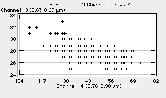 Next, consider how multispectral data typically appears in feature space. We will use a particularly simple situation to illustrate this. Figure 3 shows a scatter plot of two bands of Landsat Thematic Mapper data for an agricultural area. The area involved covers only two agricultural fields, one containing corn and the other soybeans. One sees from this graph that the separability of these two classes is not apparent from the scatter plot. The different crop responses do not manifest themselves as relatively distinct clusters. Rather, the data distributes itself more or less in a continuum over this space. This is typical of multispectral data, and indicates that the characteristics that allow discrimination between classes are more subtle than such straightforward examination would permit. In fact, a maximum likelihood classification of these data yields a 79.8% accuracy for the two classes of corn and soybeans. If all 7 bands of the data are used, this accuracy rises to 100%. Viewed in image space these two areas appear essentially identical; in spectral space, where only first order spectral variations are apparent, they appear heavily overlapped, and yet, tested quantitatively in feature space, they are shone to be quite separable.