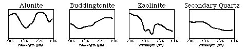 Earlier, several feature extraction algorithms were listed. Following is a brief illustration of how the feature extraction concept worked in a problem to discriminate between minerals of geologic interest (Hoffbeck and Landgrebe, 1996; Hoffbeck, 1995). In this case, it was known that the minerals involved have a specific, narrow band absorption features in the 2 µm region. The four graphs in Figure 5 show these features (Goetz and Srivastava, 1985). Hyperspectral data in 210 bands from 0.4 to 2.4 µm were gathered using the AVIRIS system sensor over a potential mining site of interest in Nevada, with the desire to map these four minerals as expressed on the surface.