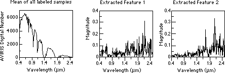 The graph on the left of Figure 6 shows the average radiance level of data gathered by the AVIRIS hyperspectral sensor. It is seen that the signal level will be quite low in the region above 2 µm, where the known diagnostic absorption features are located. The two graphs on the right of Figure 6 show the first two features extracted by the discriminant analysis feature extraction (DAFE) method. The magnitude of a DAFE feature at any specific wavelength is related to the relative significance of that wavelength for discrimination purposes. Two observations are relevant.