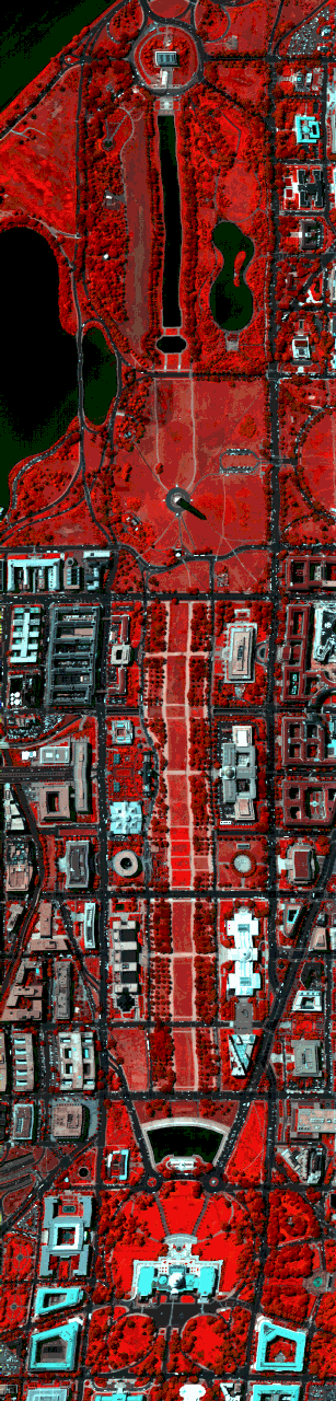 We conclude with an example analysis of an airborne hyperspectral data flightline over the Washington D.C. Mall. In this case the data were collected by the HYDICE sensor in 210 bands in the 0.4 to 2.4 micron region of the visible and infrared spectrum. This data set contains 1,208 scan lines with 307 pixels in each scan line. It totals approximately 150 Megabytes. The primary class of interest was rooftops, however, to provide an adequately exhaustive list of classes, roads, trails (graveled pathways), trees, grass, and other were added to the class list. The class included spectral classes for water and shadow. A simulated color infrared photograph form of image space presentation, along with the result of the analysis in thematic map form, is shown on a following page as Figure 7. The challenge of the task arises principally from the fact that (a) there are many different materials used in the building roofs of the area, and they are of various ages and a variety of conditions, and (b) some of the materials used in the roofs are the same or similar to that used in the streets.