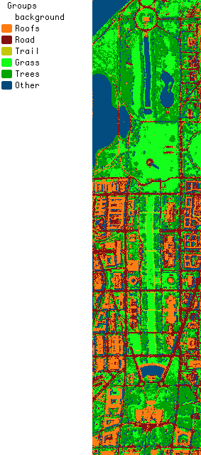 was used. It contains all the necessary algorithms. In this case, the spatial resolution of the data was fine enough that training samples could be quickly labeled for a each of the classes, including several subclasses of the class roof. Feature extraction was next used to determine a set of 10 features optimal for this task, and the classification was carried out. The result is shown in the thematic map presentation of Figure 7.