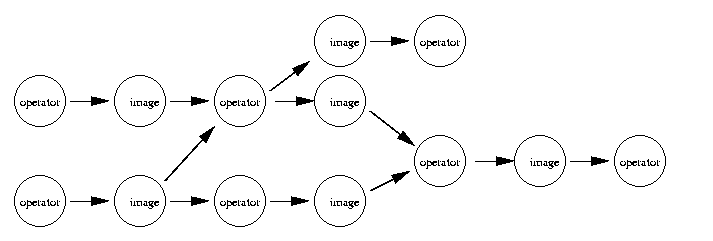 Figure 1 shows a schematic representation of a processing pipeline. A series of operators are chained together in what can be a fairly complex node graph. An operator is responsible for manipulating a chunk of input pixels to produce a tile of output pixels. Between each operator are one or more images. These may be local tile caches or may represent the entire image stored on disk (in a tiled format).