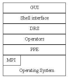 Most of peppers is implemented in C++. The initial development platform is PC Pentium II running a Linux. MPI is used for communication between nodes in a cluster; however, CORBA is being considered as an alternative for communication between ranks in a run.