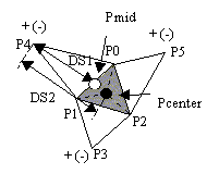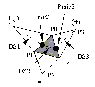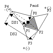 Figure1. Three neighboring triangles of a flat triangle are all higher or all lower than the flat triangle, a centroid point is interpolated and added into the TIN. The flat triangle is split into three triangles, the TIN data is adjusted. A ‘+’ indicates a higher vertex, while a ‘-‘ indicates a lower vertex. The flat triangle is filled with gray. Interpolation from one neighboring triangle is labeled. A linear method is adopted in the interpolation. The elevation of the centroid point is calculated based on points P4 and Pmid, and distances DS1 and DS2.