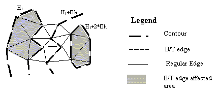 If a TIN is generated based on a contour data set, the information provided by the contour data can be used in the process of flat triangle removal. From a different perspective, knowing the presence of flat triangles ( Zhu, Eastman and Schneider, 1999) derives an edge known as a bridge or tunnel edge. Bridge and tunnel (B/T) edges are illustrated in Figure 10.
