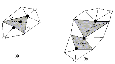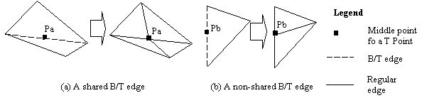 Figure 11. B/T edge processing. (a) A shared B/T edge is split into two edges by inserting a point at its middle. Four triangles are formed to replace the previous two triangles. (b) a non-shared B/T edge is split in the same way. Two triangles are formed to replace the previous flat triangle.