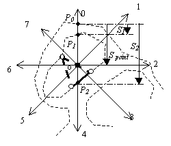 Figure 12. Eight-direction search for the interpolation of a middle point in a B/T edge. Parameters are labeled for north direction’s (direction 0) interpolation. The furthest point in that direction is used as the original; therefore, the second point is nearer to the added point, and the third point is on the other side of the added point. According to the above definition, we know S0≡0, while S1=P1P0 , and S2=P2P0.
