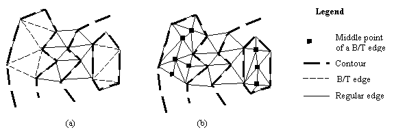 A B/T edge can be shared by two triangles, or used as a boundary edge. They are processed respectively. As illustrated in Figure 11, a point at the middle of a B/T edge is added, the B/T edge is split, and the TIN is adjusted. Figure 13 presents a comparison before and after the B/T edge removal process for a simple TIN data set generated from a contour data set.