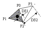 Figure 2: Two neighboring triangles are higher or lower than the flat triangle, and the third neighboring triangle is lower or higher, the edge shared with the third triangle is split by adding a middle point, related triangles are split, and the TIN is adjusted. A linear method is adopted in the interpolation. The elevation of the centroid point is calculated based on points P4 and P2, and distances DS1 and DS2. A ‘+’ indicates a higher vertex, while a ‘-‘ indicates a lower vertex. The flat triangle is filled with gray.
