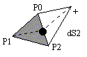 Figure 9: The flat triangle has only one neighboring triangle, the other two edges are boundary edges of a TIN. If the neighboring is higher than the flat triangle, a point is added at the middle of the shared edge, the elevation value is interpolated. A ‘+’ indicates a higher vertex. The flat triangle is filled with gray.