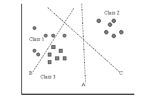 Figure 6: Hyperplane ‘A’ is constructed to separate classes 1 and 2 and ‘C’ for classes 2 and 3; however, each does both task perfectly, so one of them is redundant.