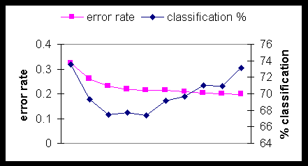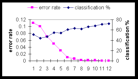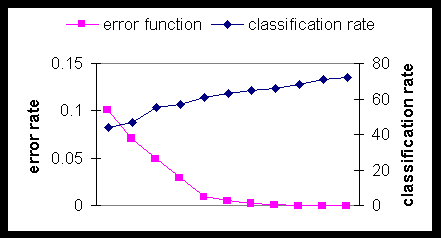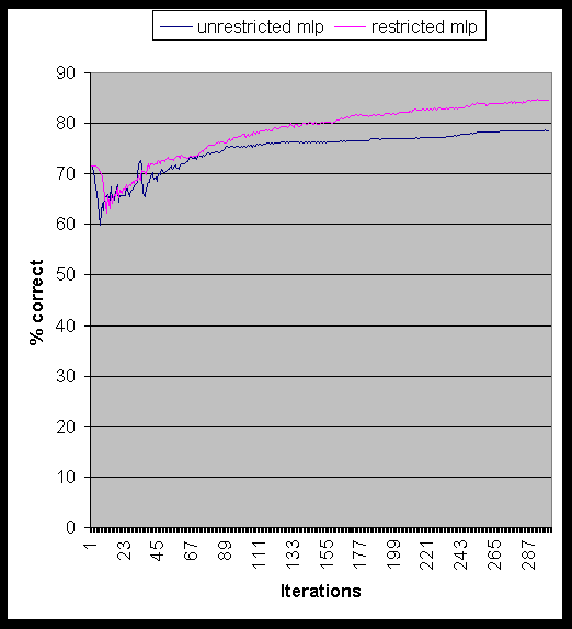 We run the network for 300 iterations and produce the tables and figures below. Table 5 gives the classification results, compared to the original MLP model, Table 6 shows the class confusion matrix, and Figure 7 shows the comparative % classification as a function of the number of training iterations.