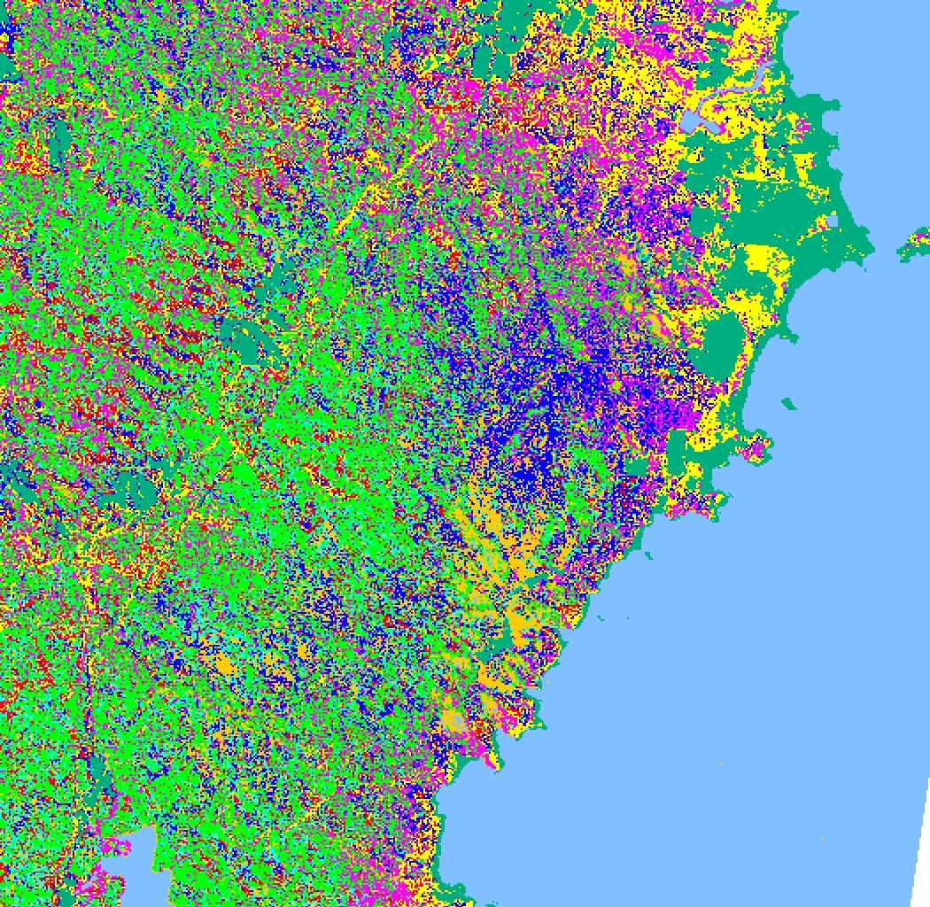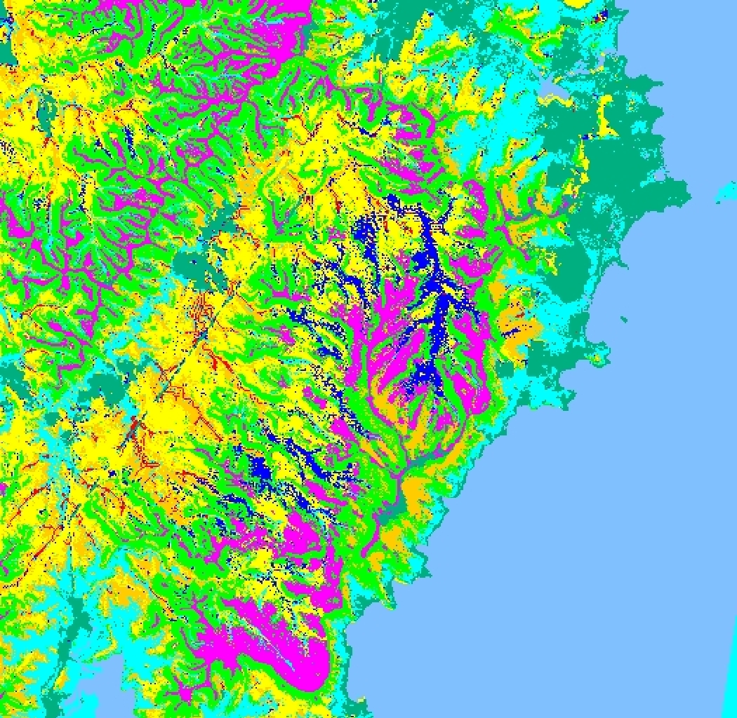 Table 1 gives some comparative performance figures for various classifiers on the same complex dataset. The dataset is from the Kioloa area of New South Wales, Australia, which has been made available as a NASA pathfinder data-set through the Australian National University in Canberra (Lees and Ritman, 1991). A Landsat composite image is shown in Figure 5. The study area is a complex natural forest habitat of approximately 15 km square and there are 9 floristic-level classes to be delineated from 11 attribute layers (four of these represent nominal or ordinal data, four are Landsat TM bands) i.e. q = 9
