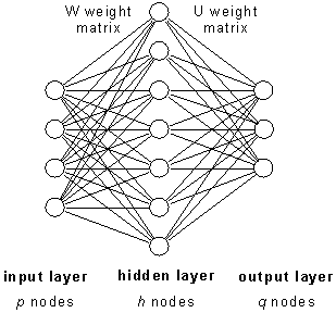 In contrast, the task-based multi-layered perceptron (MLP), a form of neural network based on machine-learning techniques, requires no assumptions on the class data distributions (although in general, it does assume a gaussian noise distribution through the data) and has no real lower limit on the size of the training classes. The MLP consists of three layers of nodes, as per Figure 1. Each node of the (single) hidden layer, along with its subset of the W weight matrix, is responsible for the generation of a separating hyperplane within the p dimensional attribute-space. The task of each node is to separate out one particular class (ci) from one other (cj). The output layer nodes and associated connections are then responsible for the amalgamation of one or more of these hyperplanes into q-1 class boundary decision surfaces and in a process analogous to a ‘superclass’ formation, can sum disjoint regions to provide a final classification strategy. Used correctly, the MLP can give a significant improvement over the classification performance of an MLC on complex, real-world data, as shown later (or see Gahegan & West, 1998 for comparison details).